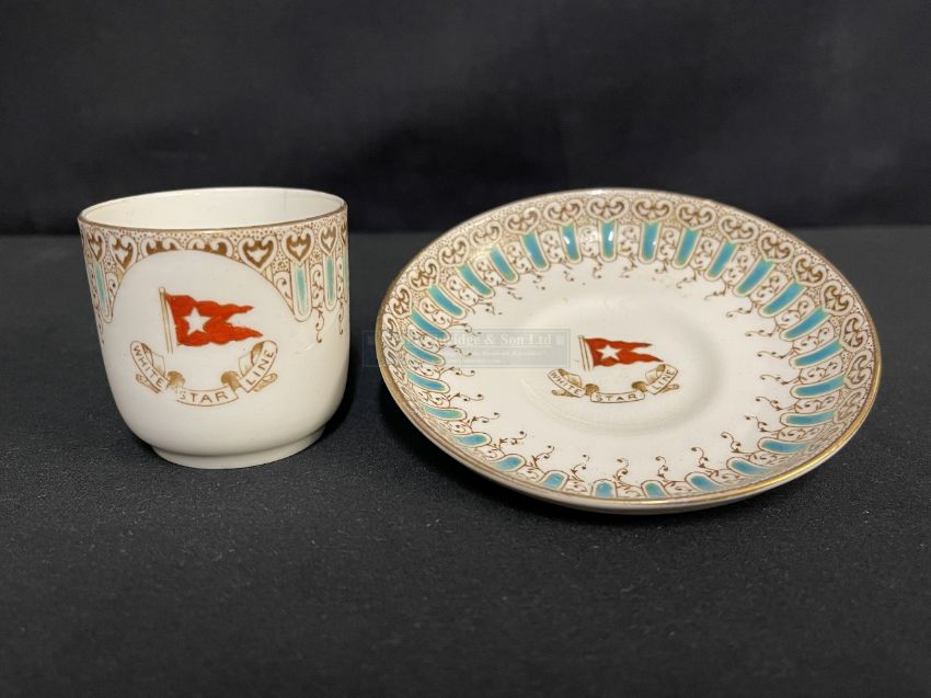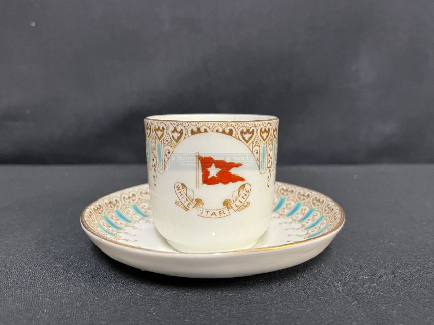 WHITE STAR LINE: First-Class Wisteria Demitasse cup and saucer dated 3/1912. Hairline crack to cup.