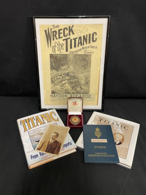 R.M.S. TITANIC: Signed edition of Titanic From Rare Historical Reports by Peter Boyd-Smith, original music score 'Wreck of The Titanic', limited edition Titanic badge, reproduction Titanic Steward Philip Littlejohn documents and reference book.