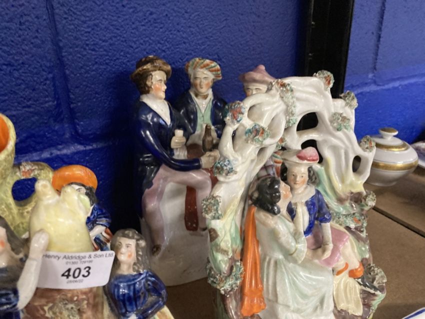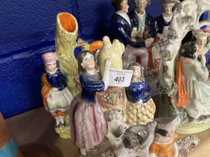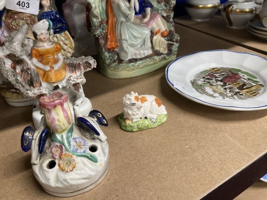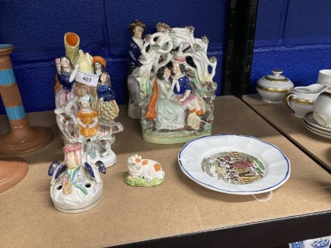 Collectables: Staffordshire figures Auld Lang Syne, an amorous couple, spill vase, girl on a goat, two other groups, a child's plate and a couple dancing. (8)
