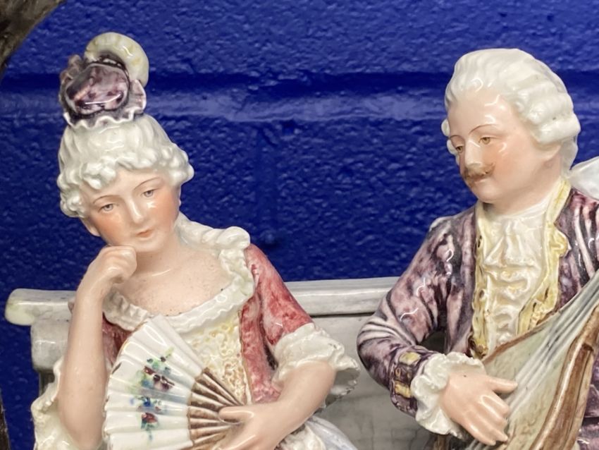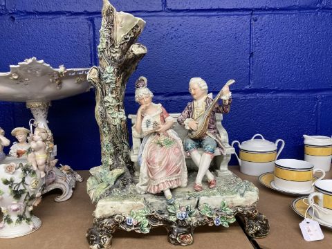 Large 20th cent. Continental porcelain group of a man serenading a lady, minor damage. 15ins.