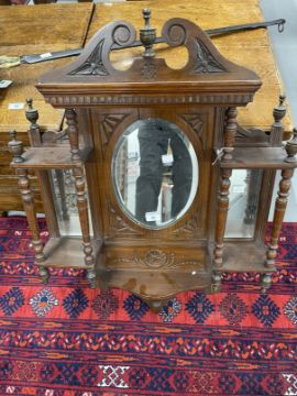 20th cent. Two tier mahogany dumb waiter on cabriole legs. 29ins. Plus Edwardian mahogany hanging wall shelves with mirror back, turned columns.