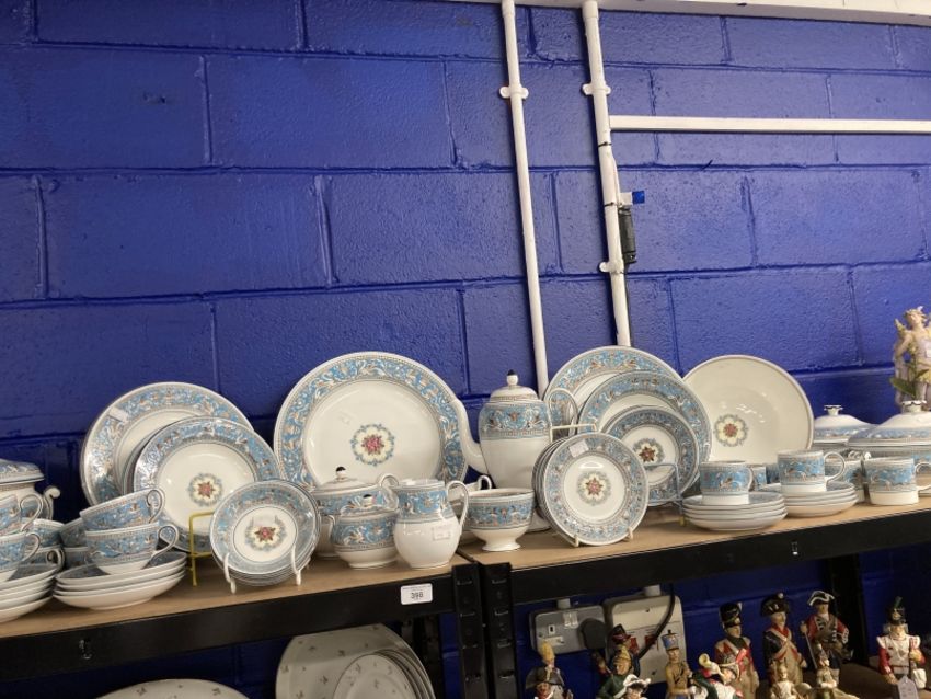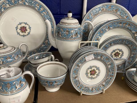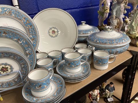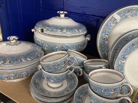 Wedgwood Florentine bone china W2714 dinner/tea/coffee service comprising dinner plates x 10, fruit plates x 11, large fruit bowl, side plates x 11, small bowls x 8, lidded tureens x 4, large plate, sugar bowl, small bowl, coffee pot, teapot, jug, coffee cans x 9, saucers x 8, teacups x 10, and saucers x 10. (88 pieces)