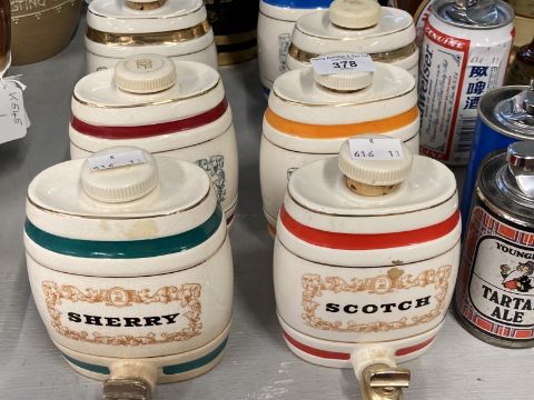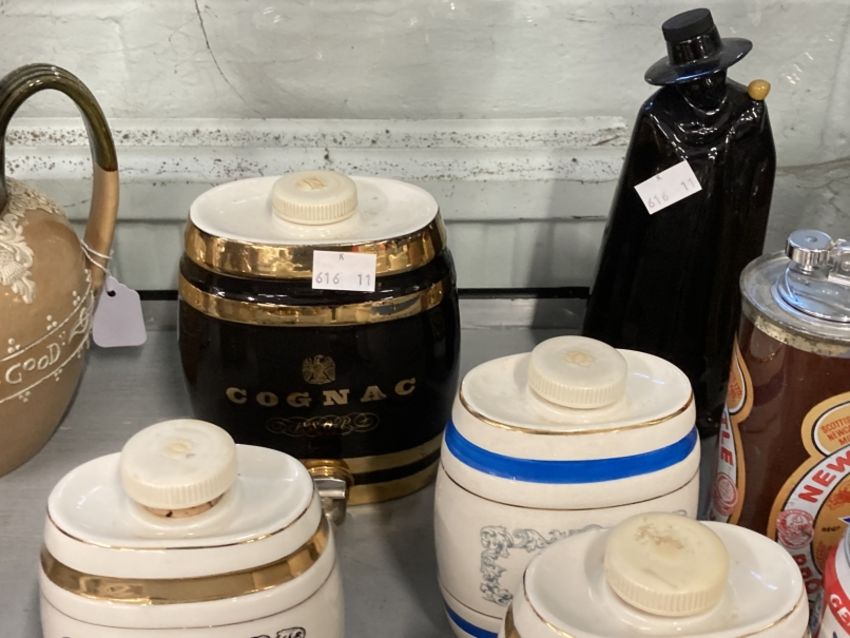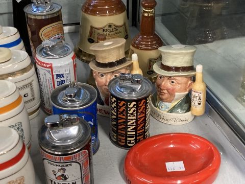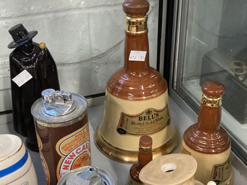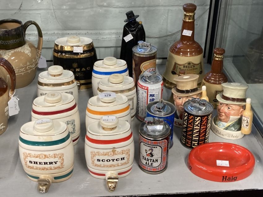 Breweriana: Royal Doulton Dewar's White Label, Pickwick deluxe Whisky Tobies, Bells decanters three sizes, Wade barrels, Sherry, Scotch, Port, Rum, Cognac, Brandy, Gin, Black Label Cognac, Sandeman. Plus five novelty beer can bar lighters Newcatle Brown, Budd, Guinness, Tartan, Ben Truman.