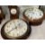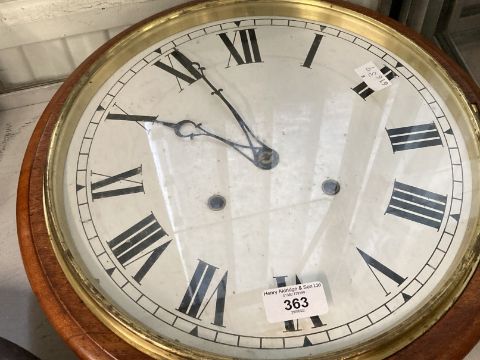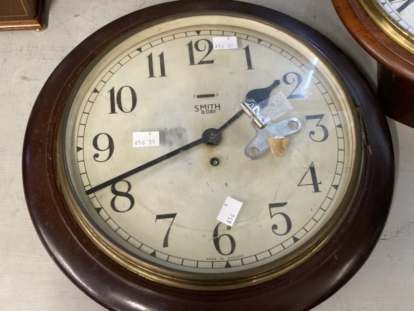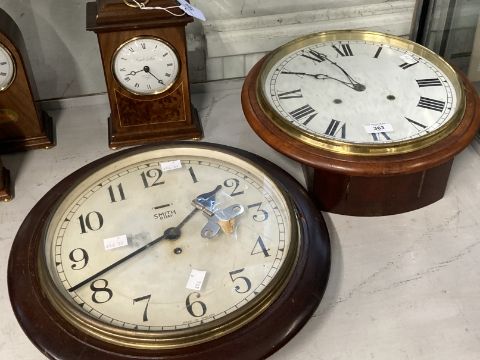 Clocks: Mahogany cased circular wall clock, spring movement, white painted dial, Roman numerals. Dia. 14ins. Dial 12ins. Plus Smith 8 day treen circular wall clock, white dial, Roman numerals. Dia. 15ins. Dial 12ins.