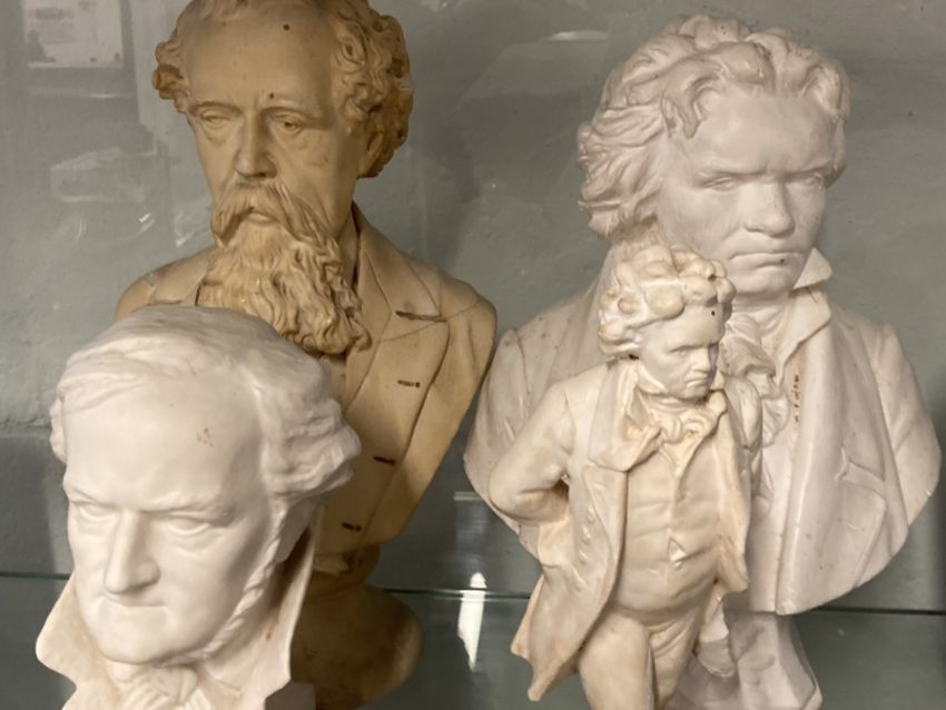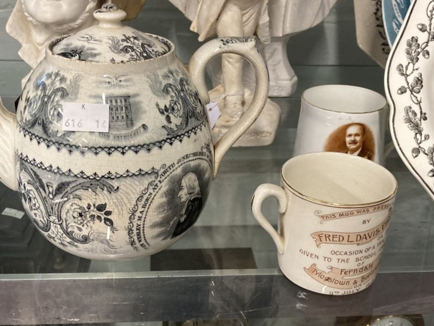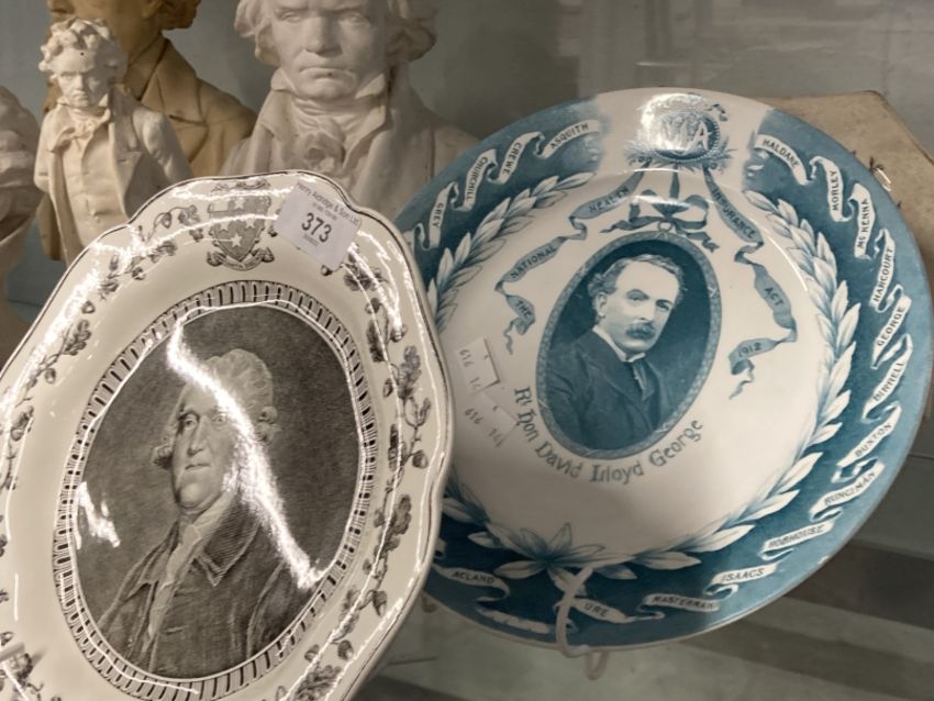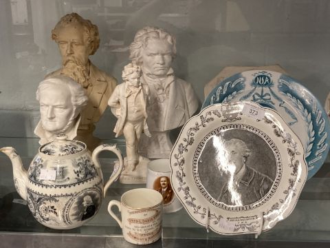 19th/20th cent. Political and historical ceramics. Gladstone eight sided plate transfer print in black central panel of Mr Gladstone, circular plate transfer print in black of Josiah Wedgwood after the portrait by Sir Joshua Reynolds, dish printed in green David Lloyd George on reverse a souvenir to commemorate the passing of The National Health Insurance Act 1912, teapot printed in grey Centenary of Hall and Mission House with print of John Wesley, mug depicting Joseph P. Crook Chief Ruler 1927, Leeds No. 31 mug to Commemorate the Coming of Age of Lewis Frederick Davis Esq. of Ferndale - the Davis family owned coal mines in the Ferndale area, the mug is dated 11 July 1913, Parian bust of Wagner signed Bochman the bust stands on a square black plinth, approx. 9ins, plaster bust of Charles Dickens impressed Chapman and Hall to reverse, approx. 13ins. A/F, and a plaster bust and figure of Beethoven.