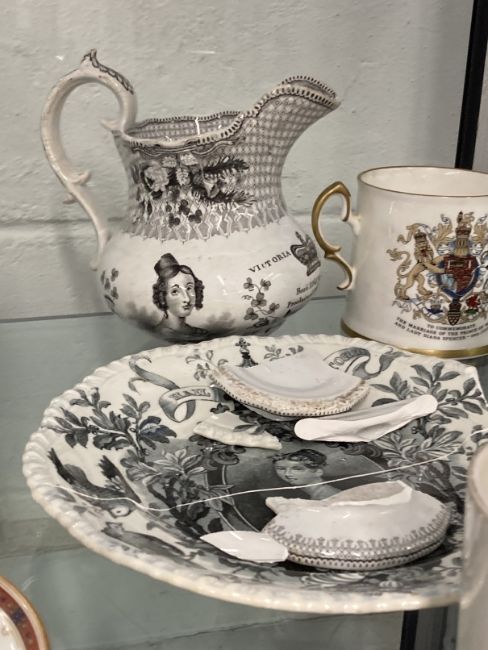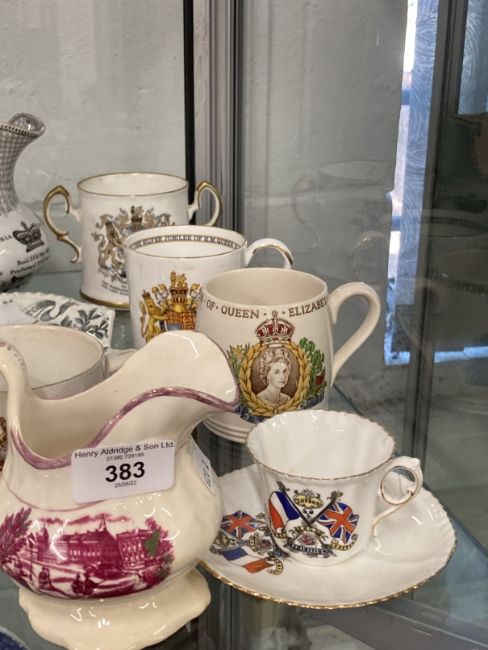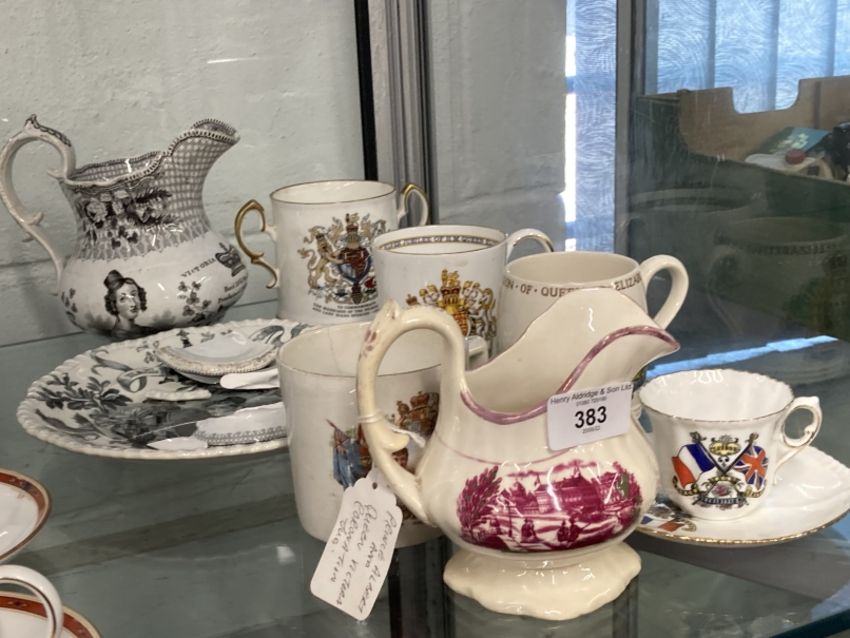 Coronation Ceramic Collectables: 19th cent. Prince Albert and Queen Victoria Coronation jug, a 1911 Long May They Reign mug, 1933 Coronation mug, 1908 Franco British cup and saucer, a Hail Victoria plate, Victoria Regina jug in need of restoration and two other mugs.