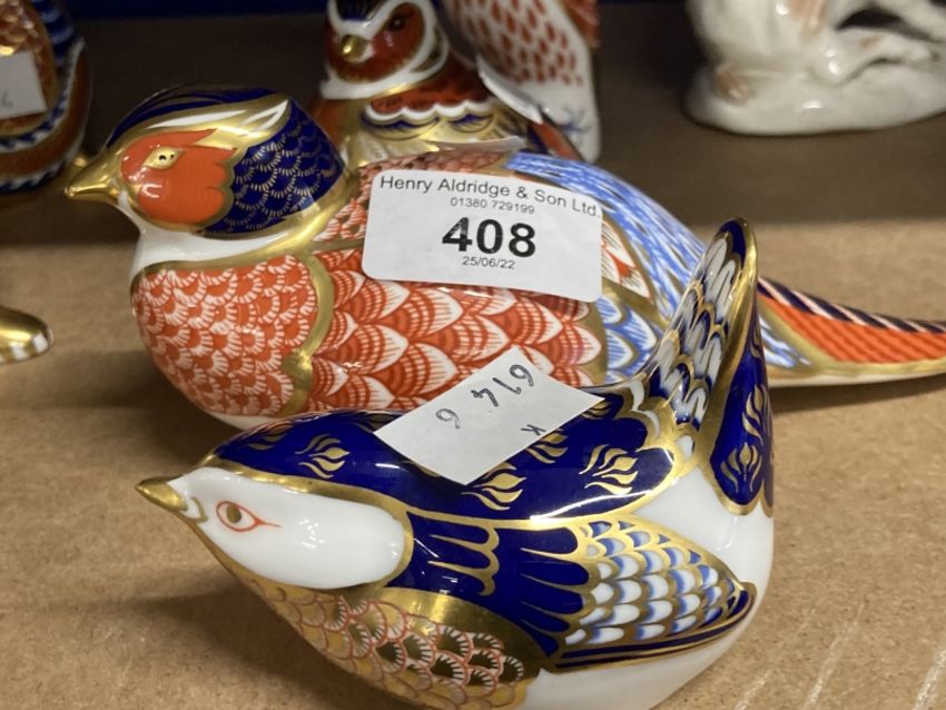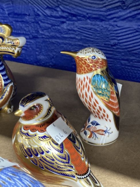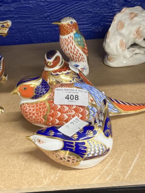 Royal Crown Derby paperweights, wren, pheasant, partridge, kingfisher, all with stoppers, unboxed.