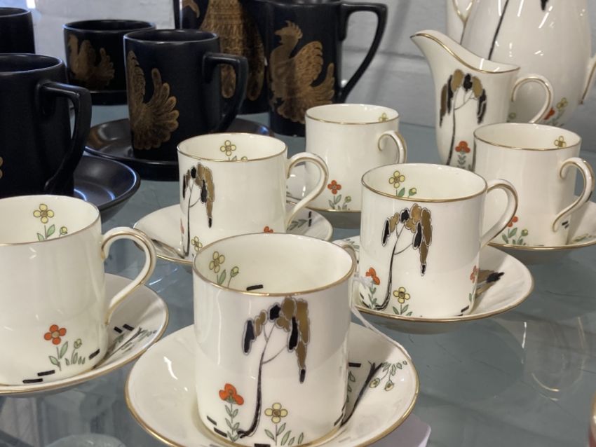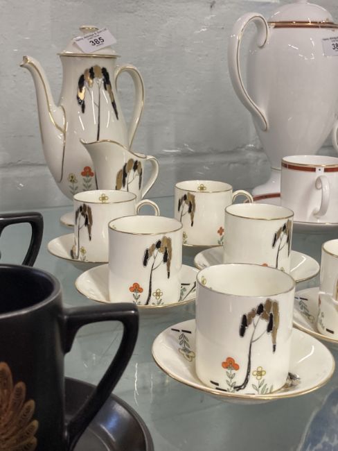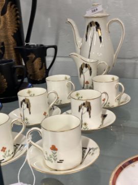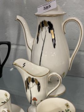 Art Deco Ceramics: Royal Doulton 'Eden' (Tall Trees) cream gilt and coloured coffee set, pattern number V112/22, comprising coffee cans and saucers x 6, cream jug and coffee pot (lid A/F).