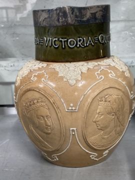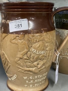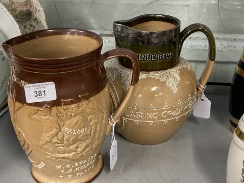 19th cent. Ceramics: Lambeth Doulton stoneware jug, Emin Pasha Relief Expedition 1887-1889 to side, moulded relief portrait of Stanley and members of the expedition, approx. 18ins. Doulton stoneware jug, silver rimmed Deo Gratia jug 1896, approx. 8ins.