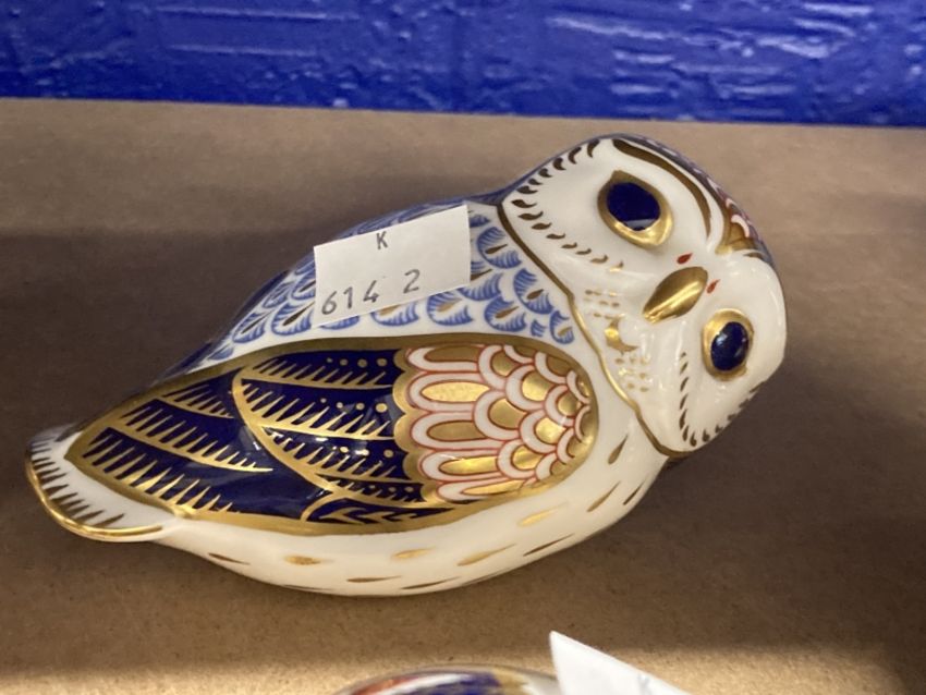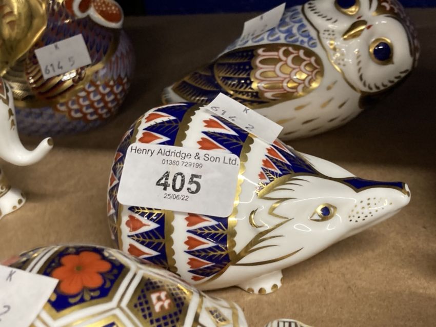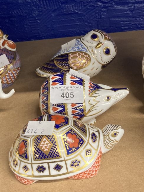 Royal Crown Derby paperweights, turtle, hedgehog, owl, all with stoppers, unboxed. (3)