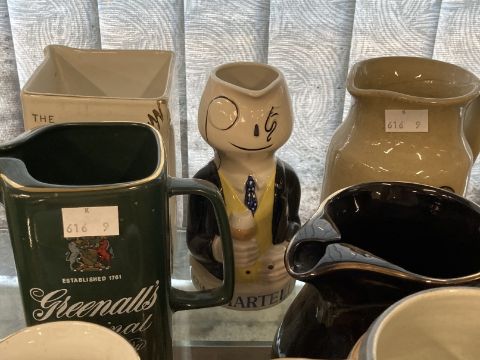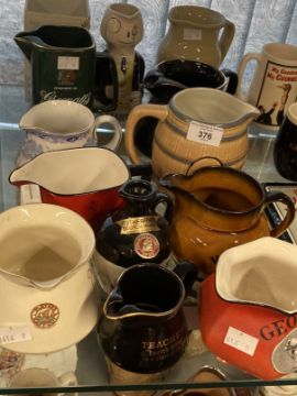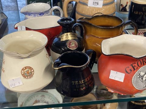 Breweriana: Water jugs, Bristol Georges' Beers, Wylds Crown Scotch red body, black handle, A/F chips to base plus small hairline - green backstamp, Teachers, Bass, Watneys, Rutherford, Players, Greenhall, Johnny Walker, Martell, Queen Anne, Schweppes. (13)