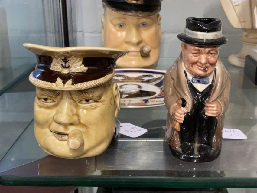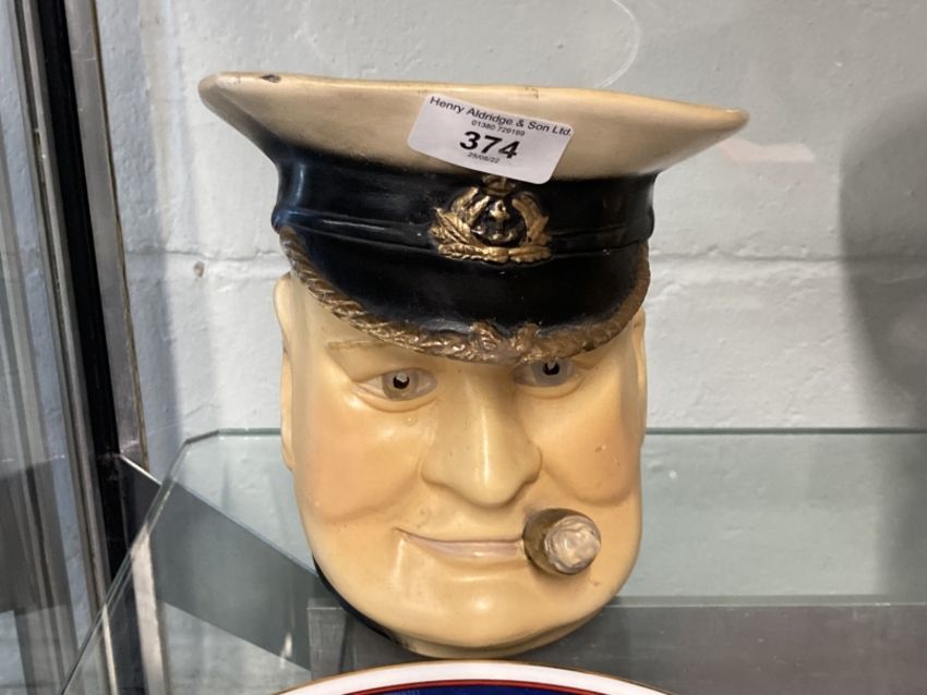 Churchill Memorabilia: Royal Doulton Winston Churchill figure, seated, Avon Company 1941. Churchill mug, Churchill is smoking a cigar and also the badged cap of an Admiral of the Royal Navy, the band is in the form of a rope. 6ins. x 4ins. Biscuit Toby possibly the earlier version of the Avon model with painted decoration also as First Lord of the Admiralty, incised to base British Made 126/2 in pencil 5/6d, plus modern plate.