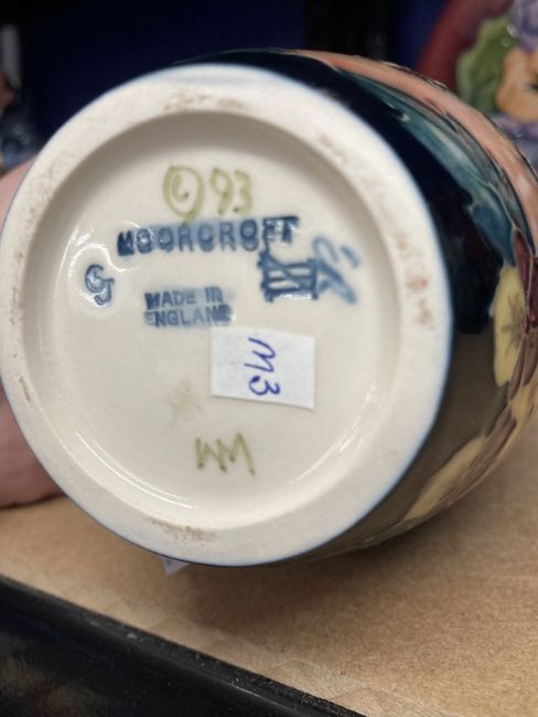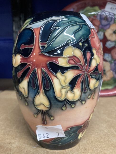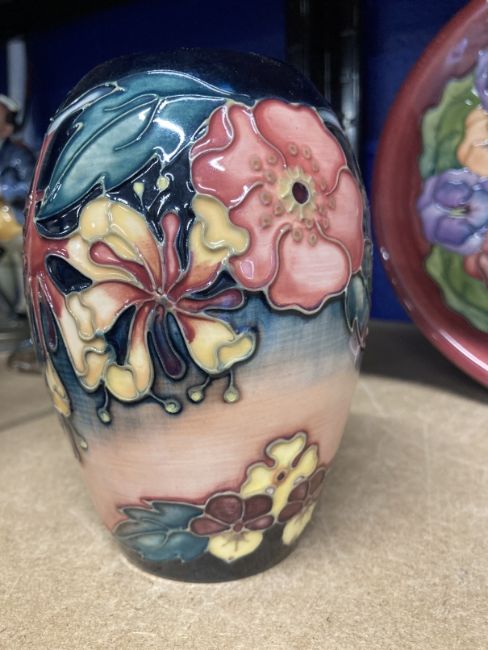 20th cent. Ceramics: Moorcroft ovoid shaped vase in the Honeysuckle pattern on pink and blue ground, ER.