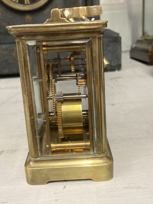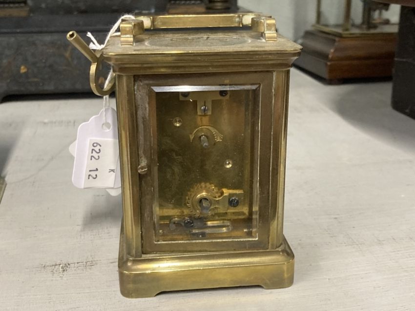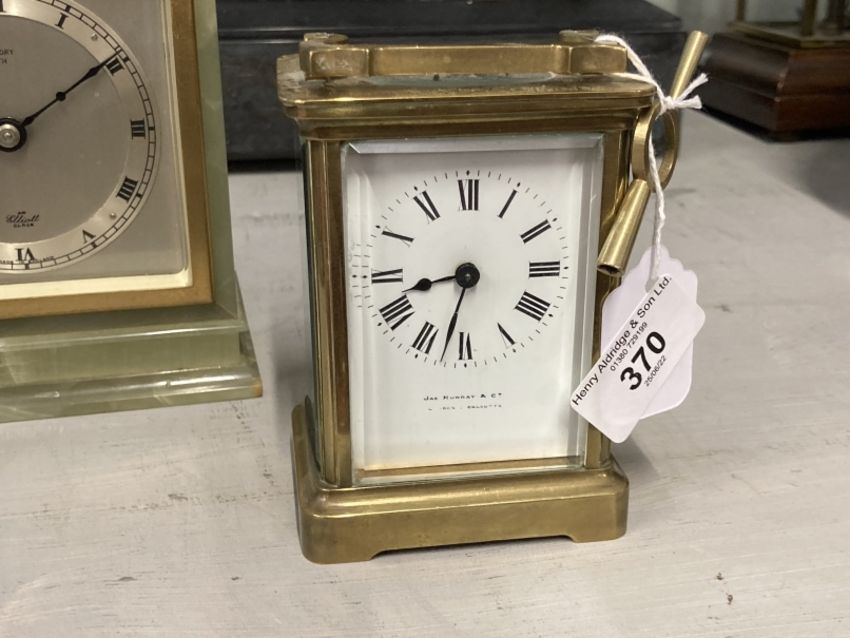 Clocks: Brass carriage clock white enamel face, Roman numerals, signed Jas Murray & Co. London/Calcutta.