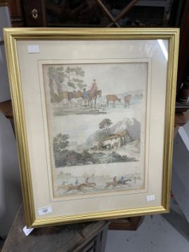 18th cent. Engraving of pastoral scenes and horse racing. Published August 6th 1790 by S W Fores, Piccadilly, framed and glazed. With 1989 sales invoice. 14½ins. x 11ins.