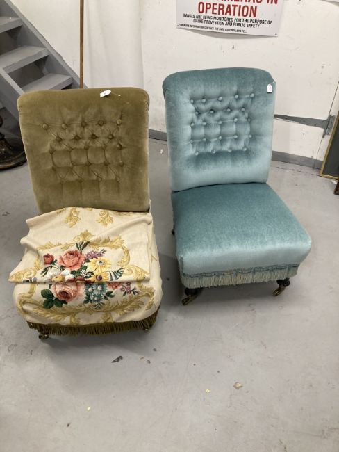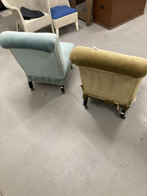 19th cent. Harlequin pair of Victorian upholstered nursing chairs on turned front supports on brass castors.