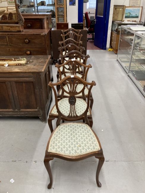Edwardian inlaid mahogany Hepplewhite style chair, shield shaped backs, cabriole legs, two carvers and five singles. (7)