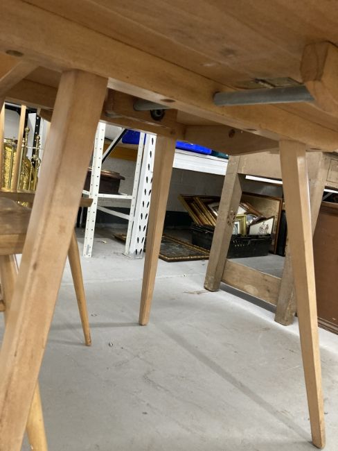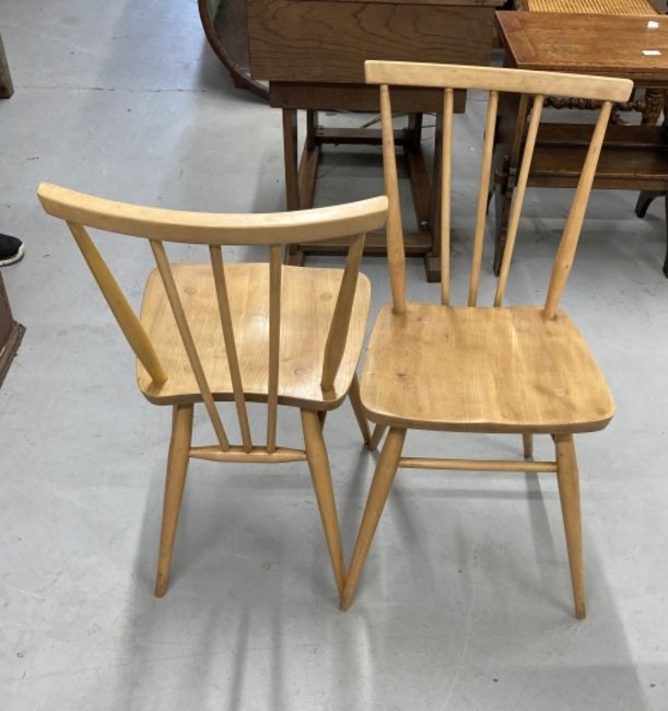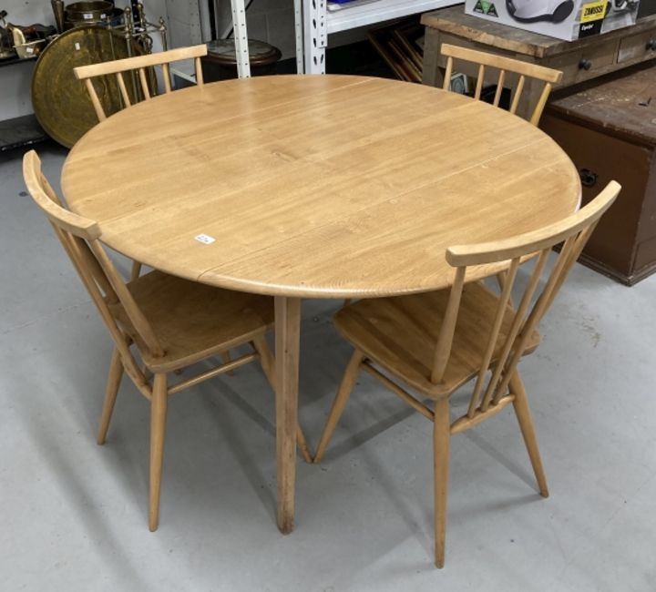 Mid 20th cent. Ercol ash oval drop leaf table and four model 391 stick back chairs with sticks extending to the stretchers.