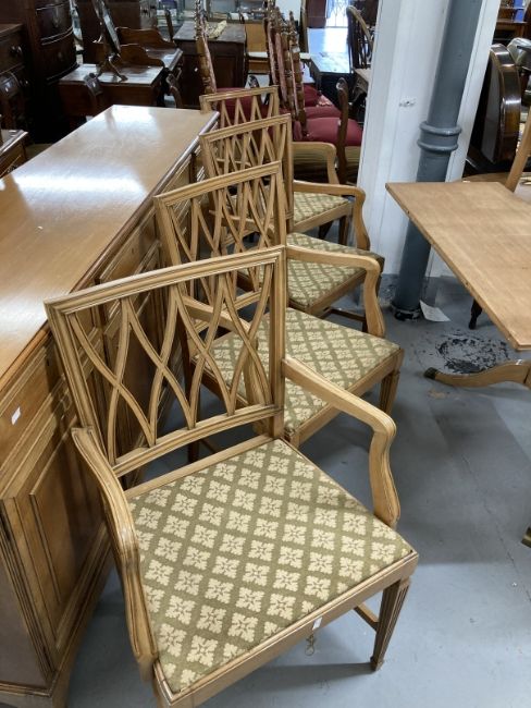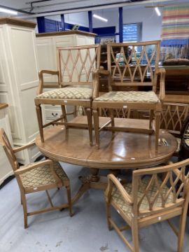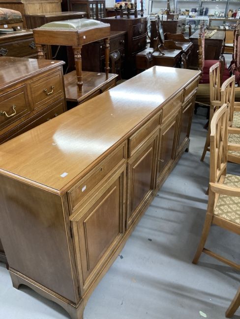 20th cent. Mahogany dining room suite consisting of eight armchairs on fluted tapered legs, a dining table with one extra leaf, oval maximum length 71ins. Width 40ins. Plus a sideboard with four drawers, moulded fronts and four cupboard doors. 33ins. x 79ins. x 17¾ins.