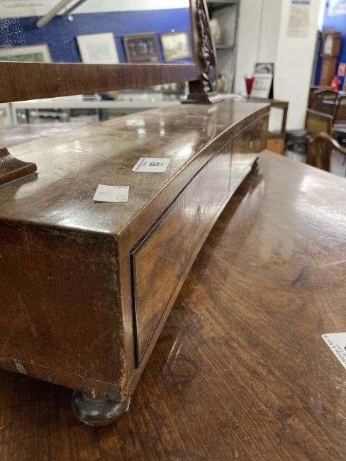 19th cent. Mahogany toilet mirror with carved shaped uprights on a concave two drawer base with ebony stringing on bun feet. 27ins. x 23ins.