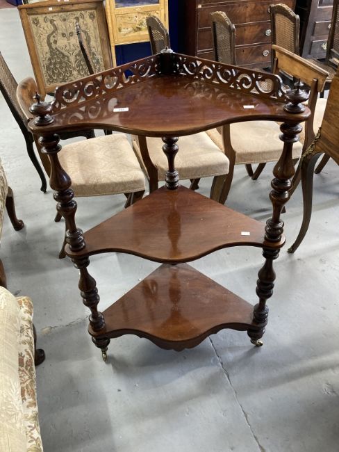 19th cent. Mahogany corner three tier whatnot with pierced gallery, serpentine shaped shelves, turned columns on brass castors. 44ins. x 28ins. x 18ins.
