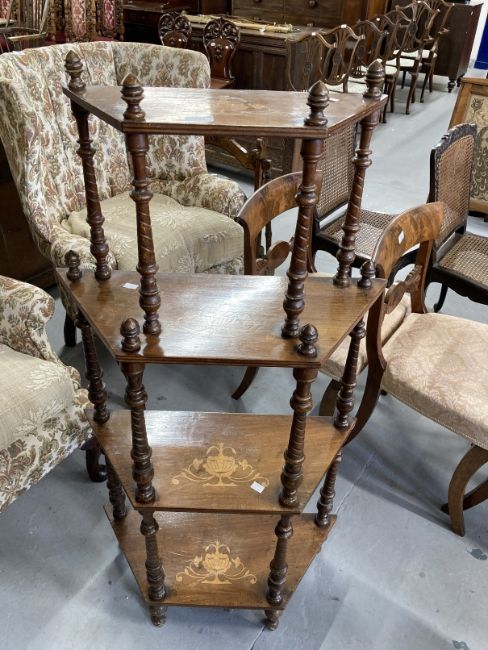 Late 19th/early 20th cent. Mahogany whatnot, four tiers with turned supports and trapezium shaped shelves with fruitwood inlay. 26ins. x 10½ins. x 52ins.
