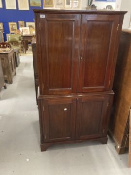 Early 20th cent. Mahogany drinks cabinet two doors above reveal mirrored interior with glass shelves and two doors below, shelved storage cupboard. 33ins. x 12ins. x 61ins.