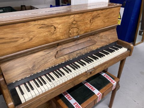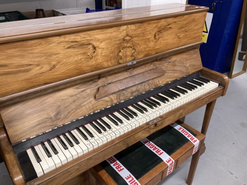 Art Deco walnut iron framed, maker W H Barnes piano and later stool.