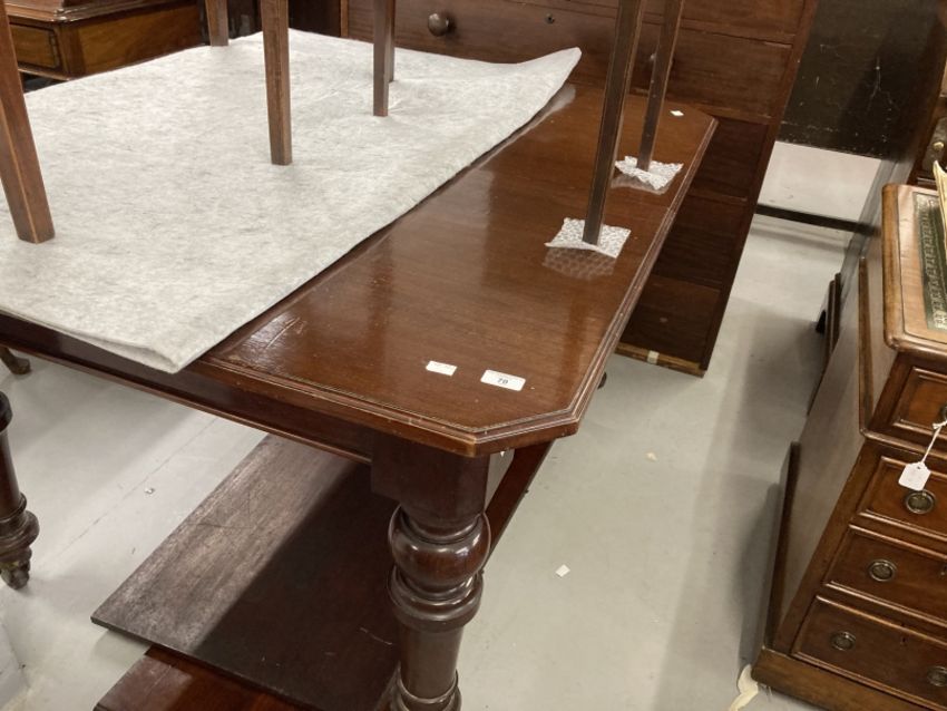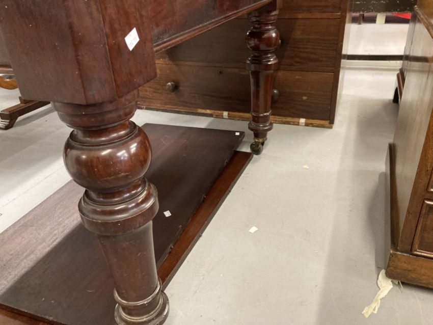 19th cent. Mahogany extending dining table on turned supports with castors, two inserts. Closed 48ins. x 42ins. x 29½ins. Fully extended 84ins. x 42ins. x 29½ins.
