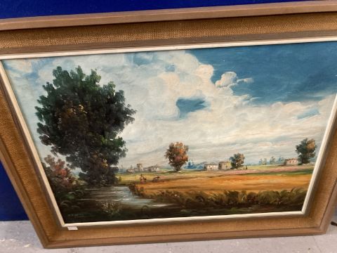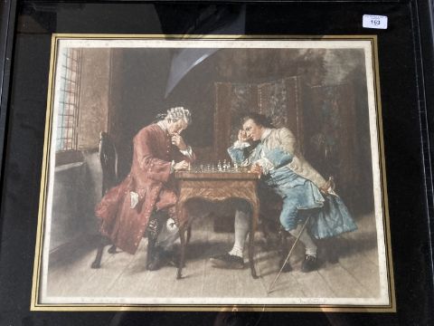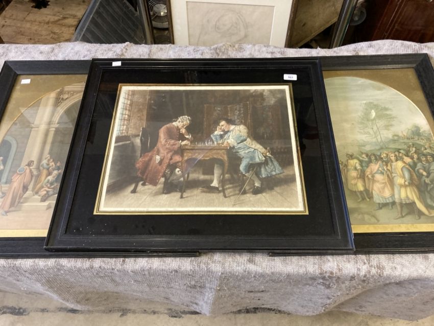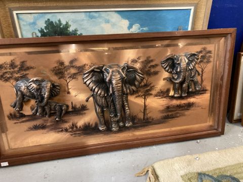 20th cent. Contemporary oil painting, oil on canvas, figures by a river, signed and framed. 19¼ins. x 27ins. 1970s Ncoyo raised copper picture of elephants, signed and framed. 17¼ins. x 39ins. Two religious coloured prints in ebonised frames and a framed and glazed coloured print, chess players. 15½ins. x 19½ins.
