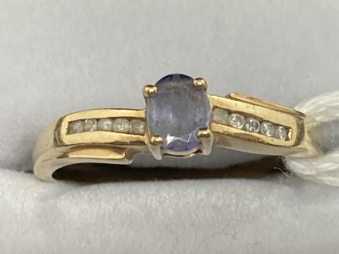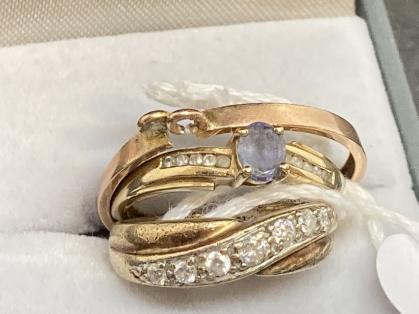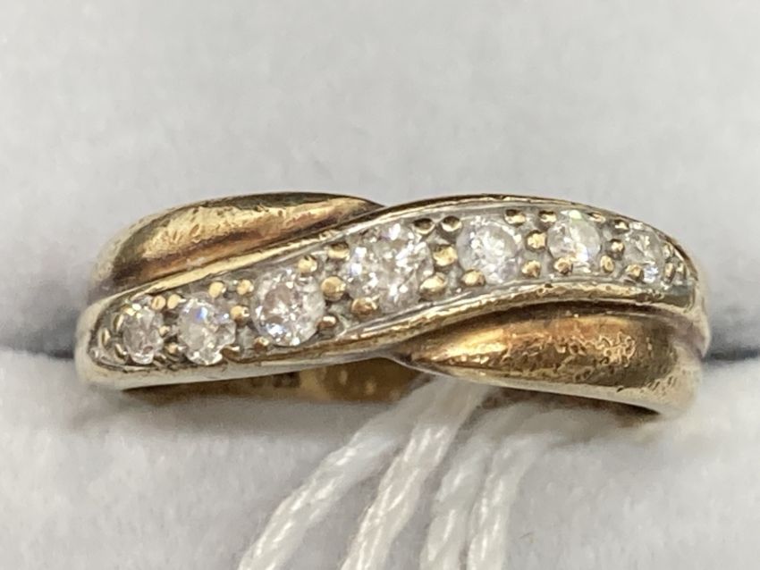 Hallmarked Jewellery: 9ct yellow gold ring in the form of a half hoop crossover grain set with seven graduated brilliant cut diamonds, estimated weight of (7) 0.25ct. Hallmarked Birmingham, ring size M. Weight 2.7g. Plus Solitaire 375 with aqua coloured stone and very small diamond shoulders. Approx. 2g. and 9ct. tests sovereign mount 1g.