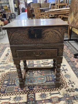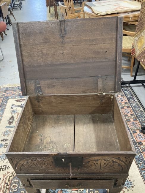 18th cent. Oak bible box on bobbin turned peg jointed stand. 21½ins. x 30ins. x 15ins.