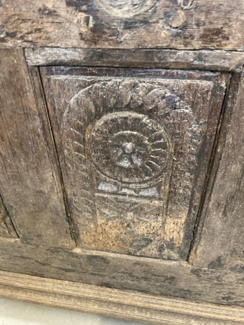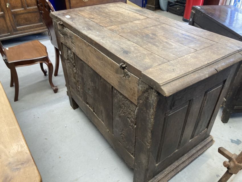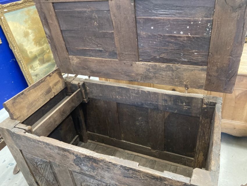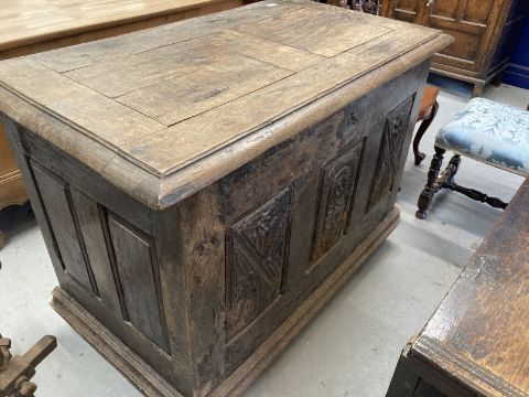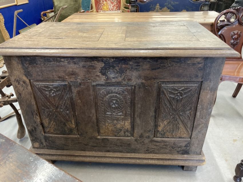 17th cent. French oak and elm coffer with three panel carved monastery style front. 46ins. x 33ins. x 25ins.