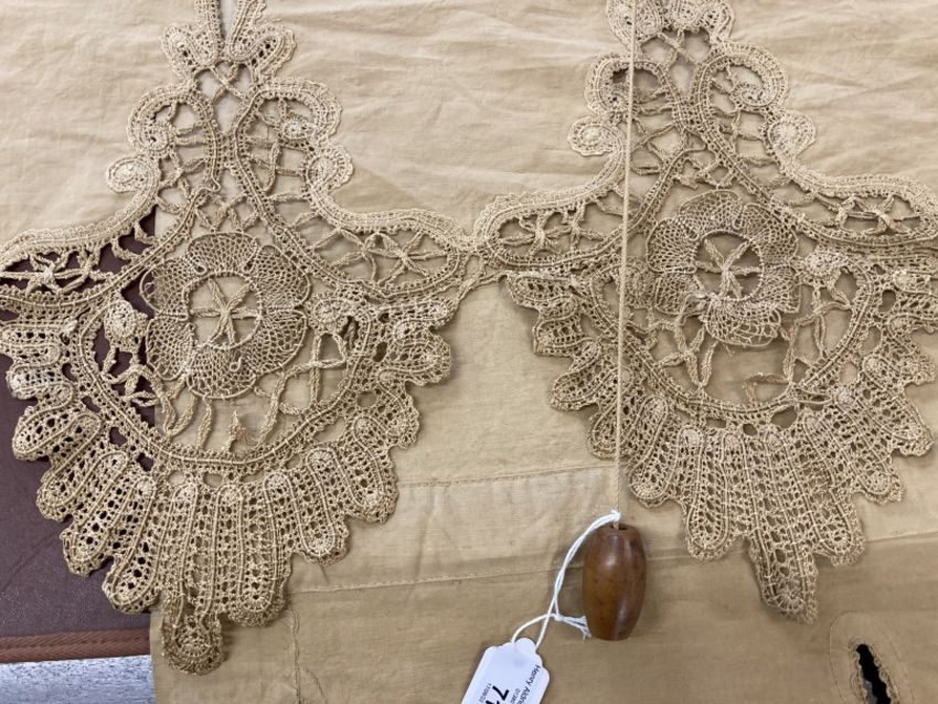 Early 20th cent. Embossed linen blinds with lace borders, a pair. Total drop 88ins. x 40ins.