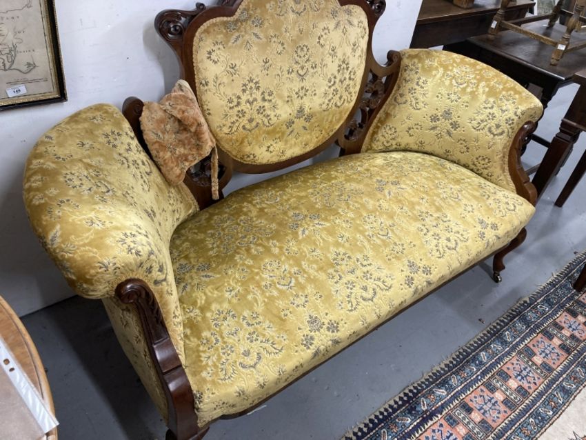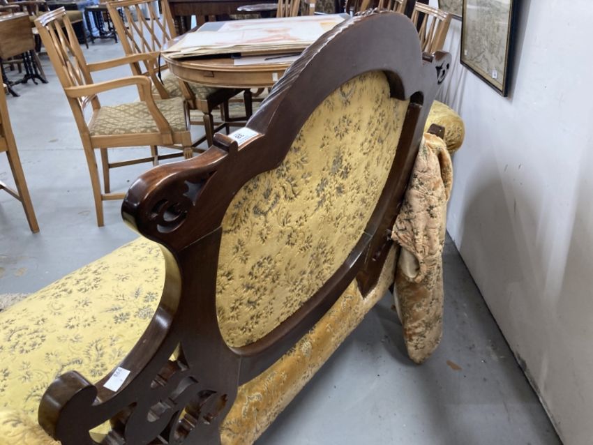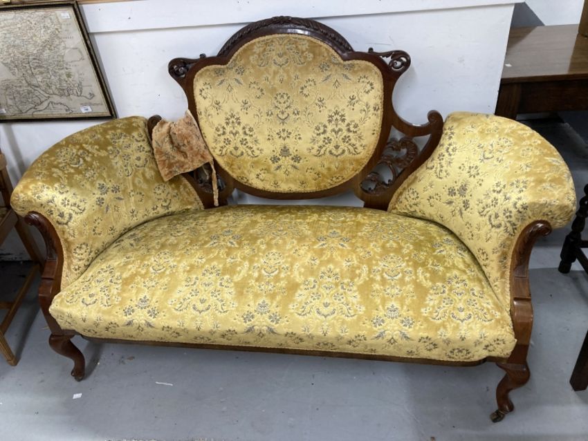 Edwardian upholstered mahogany two seater Grand Salon sofa, cabriole supports.