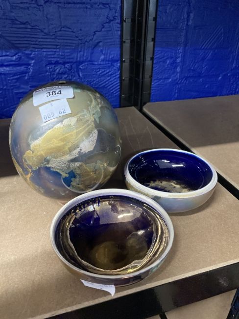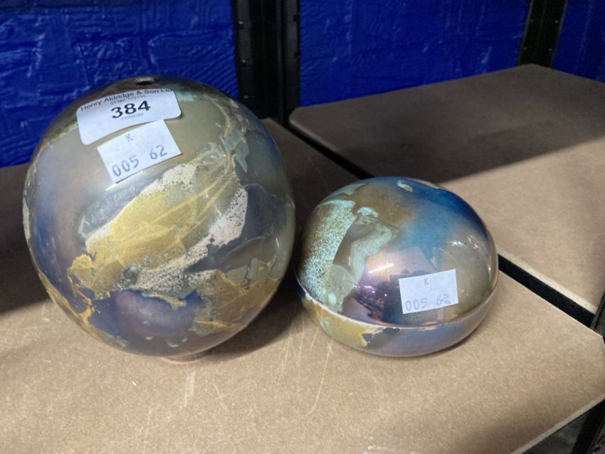 Greg Daly 20th cent. Australian Studio pottery blue and gold lustre glazed vase, signed to base. Height 6ins. Plus another Greg Daly 20th cent. Australian Studio pottery blue and gold lustre glazed lidded pot, signed to base. Dia. 4ins.