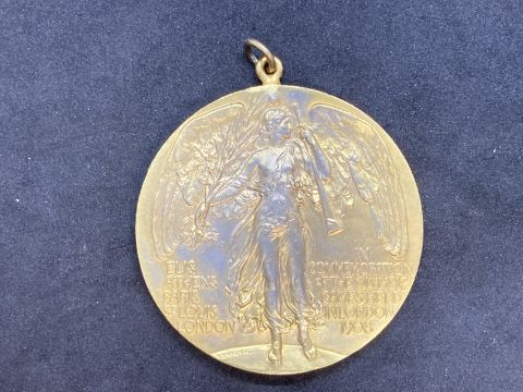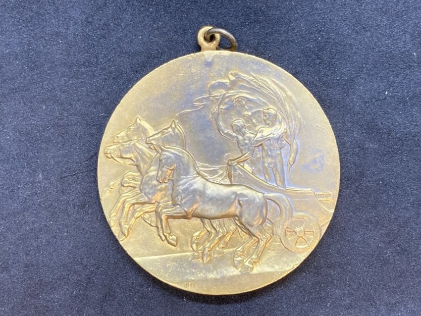 Olympic Games: 1908 pewter gilt Participation Medal, on the obverse is a Greek quadriga with the charioteer and judge side by side with the judge ready to award the athlete the victory palm, on the reverse winged figure of Victory standing on globe between legend. The medal was designed by Bertram Mackennal and minted by Vaughton & Sons, England and awarded to Officials, donors and those who did not compete. Dia. 50.7mm. Thickness 5mm. Weight 47.7gt.