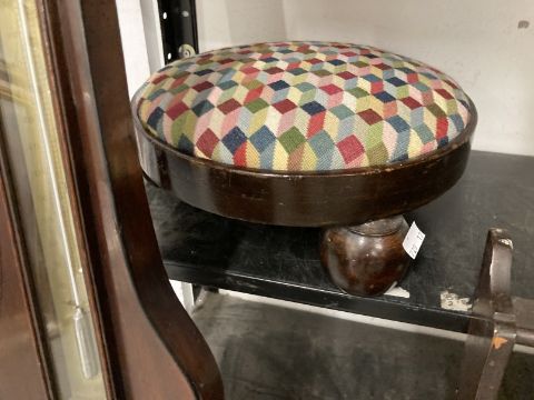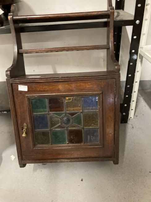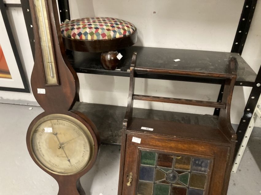 Late 19th cent. Oak smoker's wall hanging cabinet with shaped gallery top, coloured glass panel to the cupboard door, single drawer inside and a pipe rack below, with a small round footstool and a barometer.