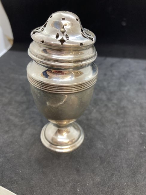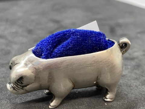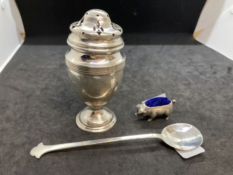 Hallmarked Silver: Jam spoon with a trefoil handle hallmarked Sheffield, pin cushion in the shape of a pig hallmarked London, sugar sifter hallmarked Birmingham. Total weight 3.08oz.
