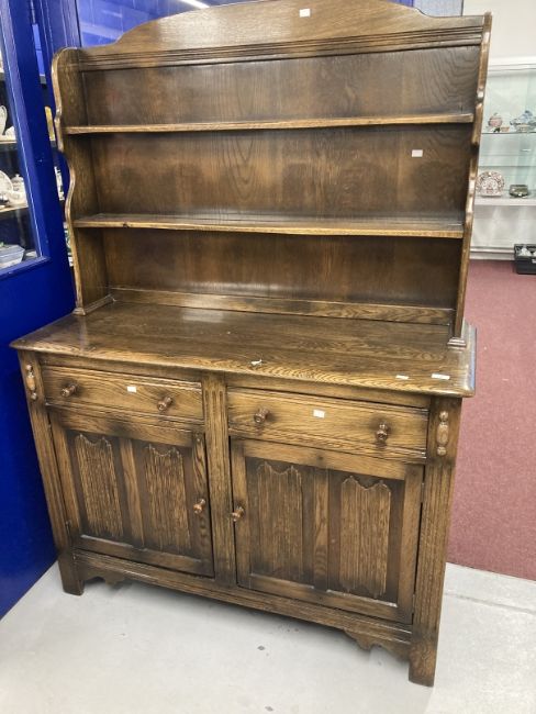 20th cent. Dark oak dresser and rack, the top with two shelves, the base with two drawers above two doors with linen fold carved panels, on bracket feet. 70ins. x 50ins. x 19ins.