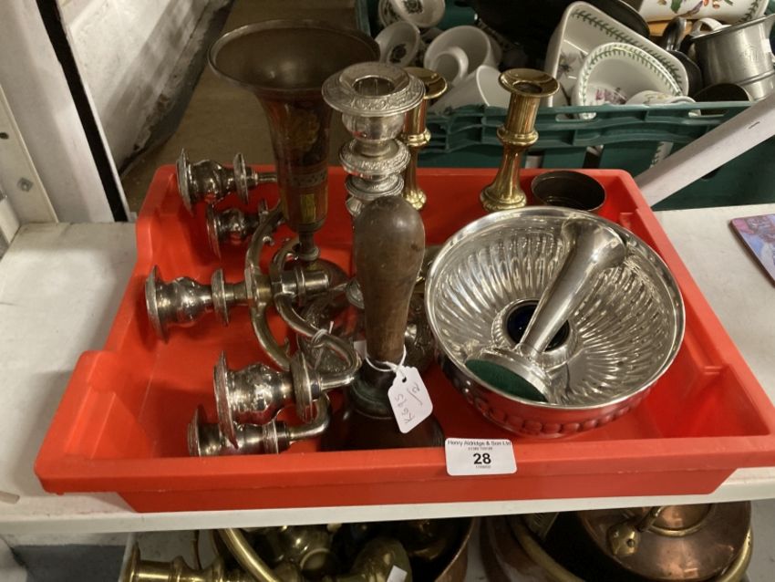 19th/20th cent. Brass and electroplate bowl, vase, salt, four branch candelabra, Benares brass, 19th cent. candlestick and hand bell.