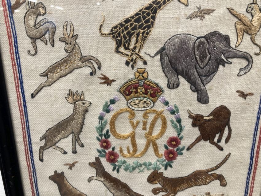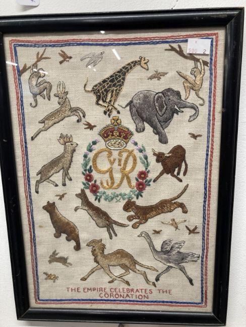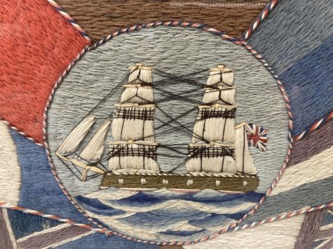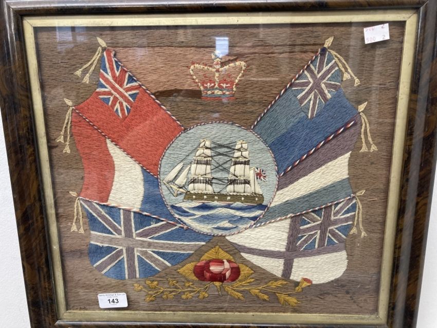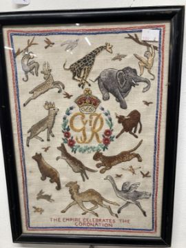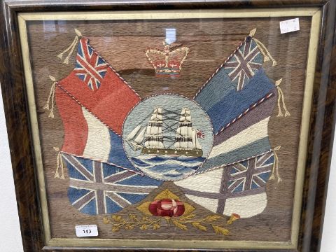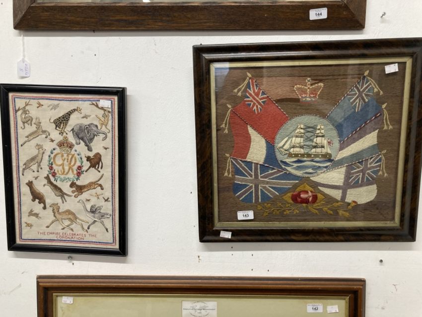 Late 19th cent. Sailorwork wool picture, a central panel with ship surrounded by flags, framed and glazed. 16½ins. x 14ins. Plus An Empire Celebrates the Coronation embroidery, framed and glazed. 15ins. x 10ins.