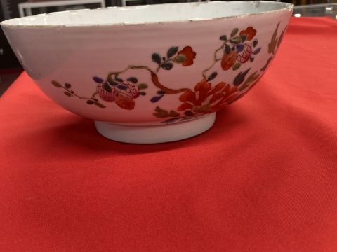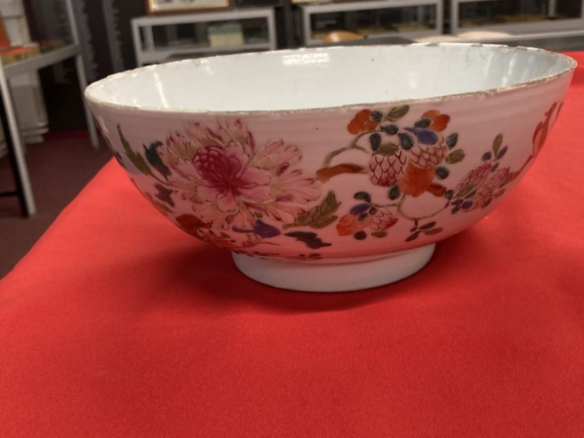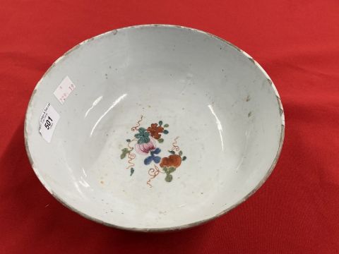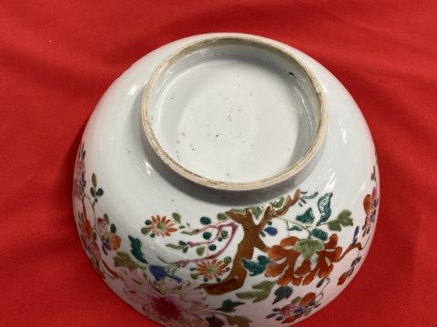 Late 18th cent. Chinese famille rose bowl decorated with a bird amongst flowers and branches, fritting and nibbles to the edge. 9ins.