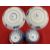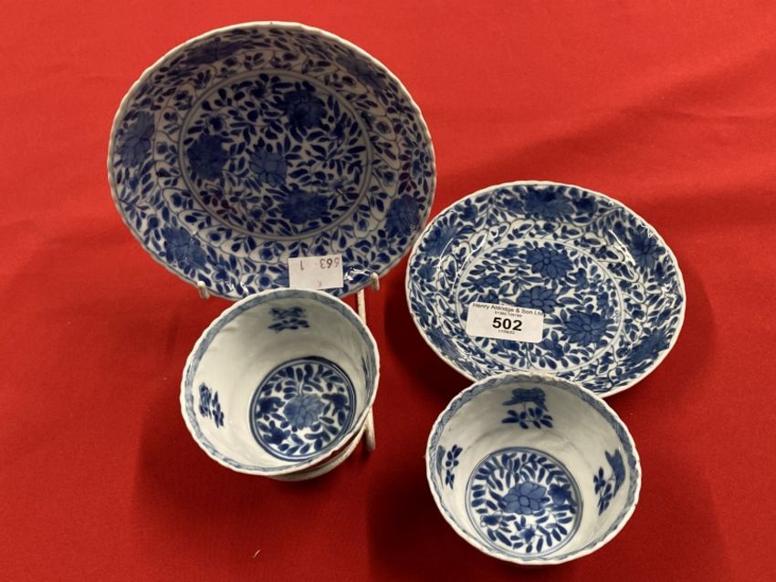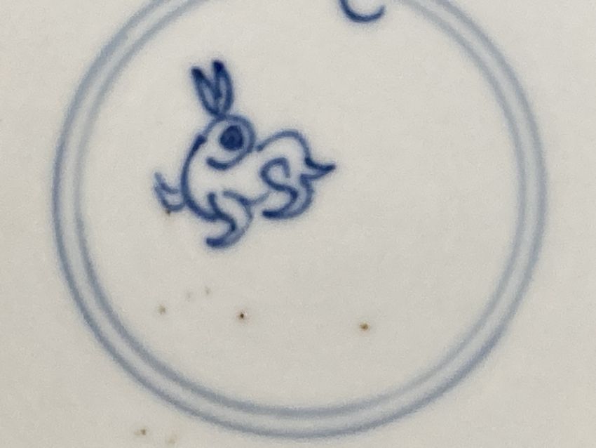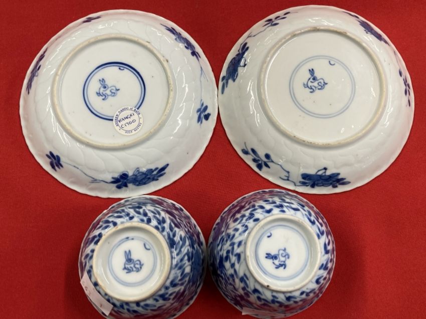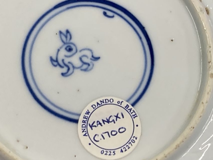 Chinese: K'ang-hsi period (Kang-Xi) tea bowl and saucer, blue and white floral pattern (chrysanthemums), hare looking at the moon mark to base inside two circles x 2. With Andrew Dando I.D label c1700.