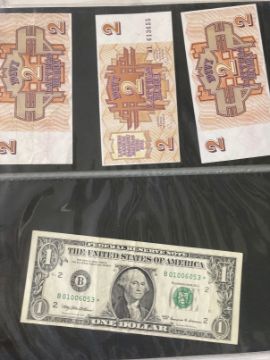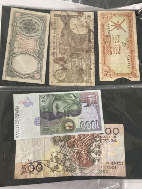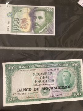 Numismatics: Banknotes, an album containing thirty eight World notes including Mozambique 100 Escudos, Spanish 1000 Pesetas, Peru 1000 Intis and Barbados 5 Dollars. Plus a small number of postal covers and cards, etc.