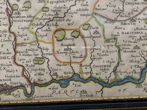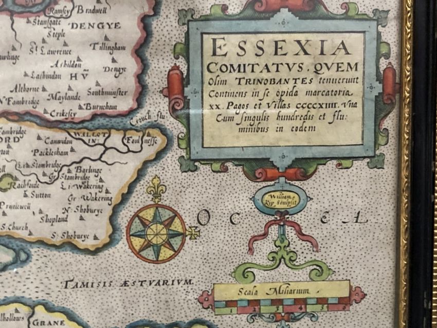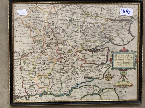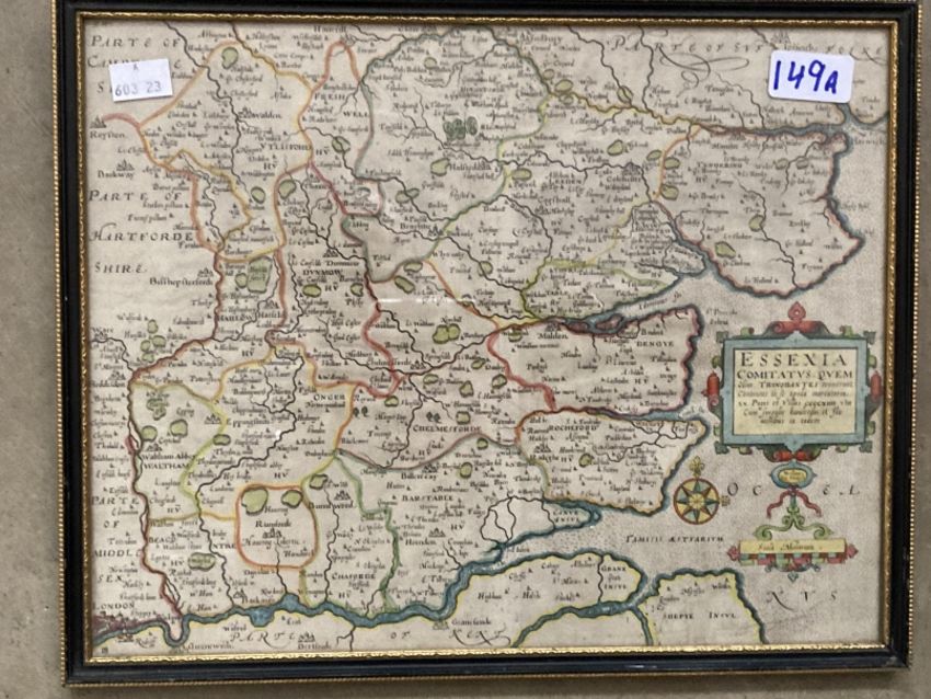 Antiquarian Maps: Early 17th cent. Hand coloured map of Essex, unknown cartographer, annotated in Latin, central vertical crease. Framed and glazed. 14ins. x 11½ins.