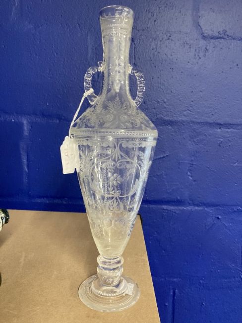 Glassware: 19th cent. Glass vase finely engraved with flower sprays, bead swags and leaf garlands, the narrow neck applied with two pinched handles. 13¼ins.