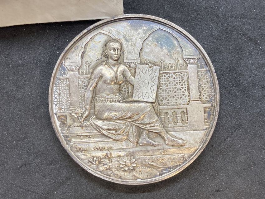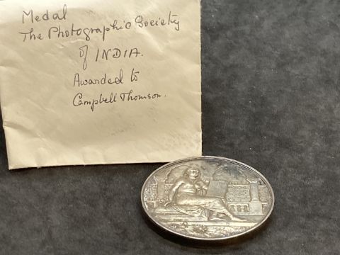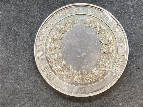 Medals & Decorations: 19th cent. The Photographic Society of India silver prize medal designed and minted by J.S. & A.B. Wyon, obverse seated female artist, reverse wreath with blank cartouche. Awarded to Campbell Thomson. Dia. 51mm. Weight 78.8gt.