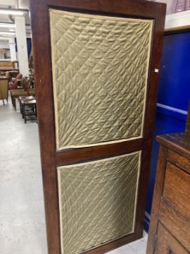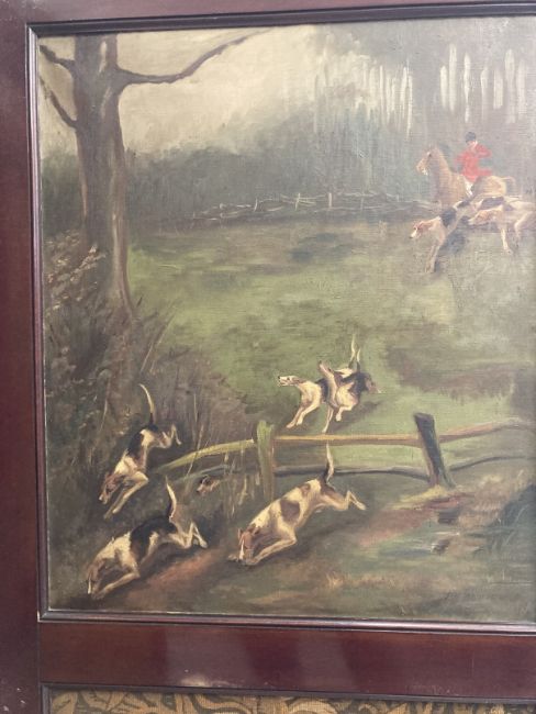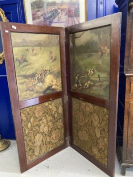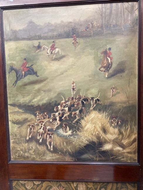 Late 19th/early 20th cent. Mahogany dividing screen, the front four panels, two with inset Morris style upholstery, the others hand decorated with hunting and country pursuits. 60ins. x 66ins.