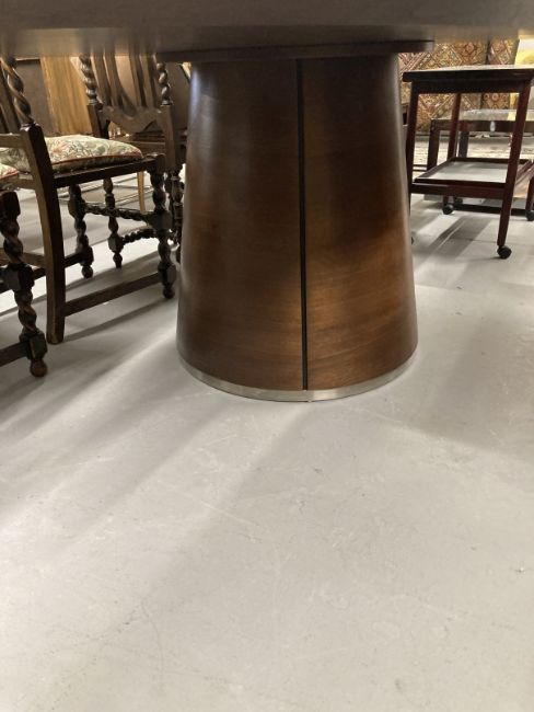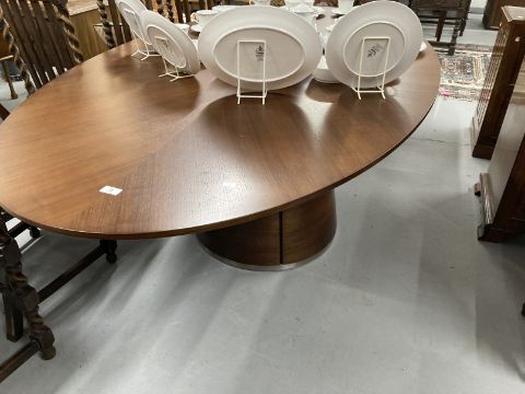 Quatropi walnut dining table the oval top with inset circular central glass panel supported by a central circular base. 86½ins. x 47¼ins. x Height 29½ins.